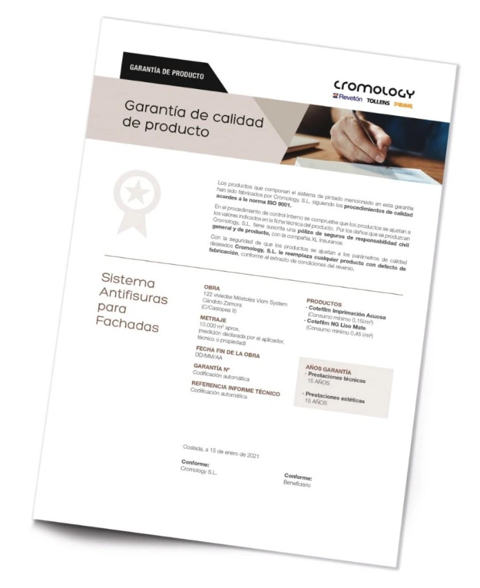 Revetón ofrece garantías extendidas para fachadas solo cuando la obra se ejecuta siguiendo su sistema técnico y supervisión, con informes técnicos, fichas de producto y la aplicación realizada por un aplicador profesional. Estas garantías no son generales del producto, sino que dependen de la correcta ejecución del sistema y de la prescripción técnica.